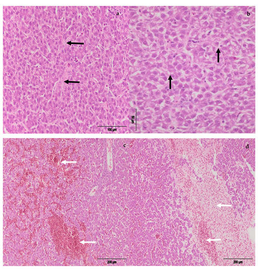 Degenerative changes (vacuolar degeneration, fatty change) of hepatocytes, (a) E-I group; (b) E-II group (black arrows); liver with hyperemia and hemorrhage, (c) E-III group, (d) E-IV group (white arrows).