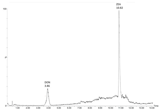 Solvents for the separation of mycotoxins (mobile phase) consisted of (A) water and (B) methanol, both buffered with 2 mmol per L ammonium formate and 0.1% formic acid. The DON and ZEA stock solutions (0.1, 0.5, 1, 5, 10, 20, 30, 50, 75, 100, and 150 ng per mL) were prepared by dissolving appropriate volumes of each compound in a mixture of solvents A and B (50:50). As an internal standard, 13C15- DON (10 ng per mL) and 13C18- ZEA (20 ng/mL) were used. All solutions were stored at −20 °C in amber glass vials and darkness until use.