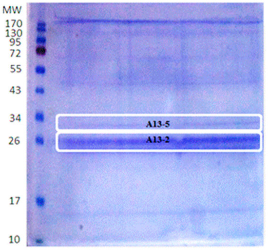 The cytotoxicity effect of A13-2 and A13-5 (26 and 30 kDa, respectively) on MCF-7 cells was similar to that described in previous reports. Brasseur et al. [17] reported that PS2Aa1 (37 kDa) had good activity against MCF-7 at 2.5 µg/mL, reducing viability to 20%. However, the authors used chemical or enzymatic processes for protein activation. Maher [19] identified two strains J61 and J72, with cytotoxic activity against MCF-7 that reduce to 50% cell viability at 1 µg/mL and 2.79 µg/mL, respectively. Other authors tested differents parasporins observing no significant cytotoxic activity against MCF-7 [20,21,22]. It has been reported that a parasporin could affect more than one cancer line of cells. Brasseur et al. [16] and Maher [19] demonstrated that their parasporins also showed cytotoxicity against other cancer cells such as MDA-MB231, PC-3, HepG2, CACO-2, K562, and Hep2.