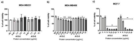 The cytotoxic activity assay results of the MDA-MB 231 and MDA-MB 468 cells treated with the parasporal proteins A13-2 and A13-5 during 48 h are shown in Figure 2a,b. The parasporal proteins do not affect MDA-MB 231 viability (Figure 2a). Parasporal protein A13-2 reduce the MDA-MB 468 viability by 30% at 4 μg/mL and protein A13-5 by 16% at 1.3 and 4 μg/mL (Figure 2b). MCF-7 cells treated with the parasporal protein A13-2 during 48 h are shown in Figure 2c. Data show that the A13-2 protein is cytotoxic against MCF-7, at 6 μg/mL cell viability has been reduced by 87%, while A13-5 protein at 8 μg/mL reduces cell viability by 80% (Figure 2c).
