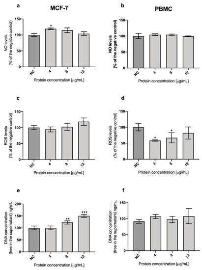 Due to endogenous and exogenous factors, the DNA could be fragmented, and it could be exported out of the cells. Hence, through the detection of DNA in the medium, a genotoxic effect may be evaluated [37] and indirectly the formation of pores in the membrane [38]. Some authors proposed that one of the possible cytotoxic mechanisms of parasporins is through the formation of pores in the membrane of the tumor cells, which leads to an osmotic imbalance and consequently to cell death [39,40,41]. The Picogreen assay is an easy and fast technique to detect a minimum amount of dsDNA (25 pg/mL) in the medium [42]. Therefore, DNA in the medium was measured in MCF-7 cells after parasporal protein A13-2 treatment with Picogreen assay. The results for MCF-7 cells treated with parasporal protein A13-2 show that the increment of the double-stranded DNA (dsDNA) in the medium is protein concentration-dependent (Figure 4e). The dsDNA fragments release was significant at 8 and 12 µg/mL, indicating that MCF-7 cells were damaged, probably due to cellular apoptosis and necrotic cell (Figure 4e). Although, in PBMC cells, this damage was not observed (Figure 4f). Currently, there is no data available in the literature about the ROS and NO levels or even in the fragmented dsDNA concentration in cultures treated with parasporin. However, what is clear is that there is specific membrane damage induced by parasporal protein A13-2 on the breast cancer cells, where the formation of pores in the membrane might be related.