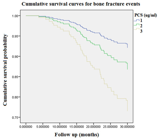 Accumulating event-free survival curves of bone fracture risk among patients with respect to different tertiles of circulating PCS during 9968 person-months of follow-up. Tertile 1, PCS concentration < 16 μg/mL; Tertile 2, PCS concentration = 16–26.8 μg/mL; Tertile 3, PCS concentration > 26.8 μg/mL. PCS = p-cresyl sulfate.