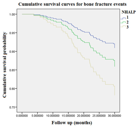 Accumulating event-free survival curves of bone fracture risk among patients with respect to different tertiles of plasma concentrations of NHALP during 9968 person-months of follow-up. Tertile 1, NHALP concentration < 70 IU/L; Tertile 2, NHALP concentration = 70–100 IU/L; Tertile 3, NHALP concentration > 100 IU/L. NHALP = non-hepatic alkaline phosphatase.