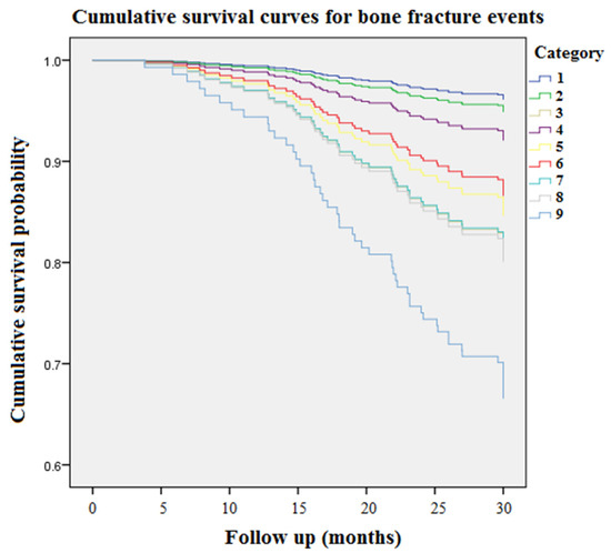 Accumulating event-free survival curves of bone fracture risk among patients with respect to different categories of plasma concentrations of PCS and NHALP during 9968 person-months of follow-up. Category 1, PCS < 16 μg/mL and NHALP < 70 IU/L; Category 2, PCS 16–26.8 μg/mL and NHALP < 70 IU/L; Category 3, PCS > 26.8 μg/mL and NHALP < 70 IU/L; Category 4, PCS < 16 μg/mL and NHALP 70–100 IU/L; Category 5, PCS 16–26.8 μg/mL and NHALP 70–100 IU/L; Category 6, PCS < 16 μg/mL and NHALP concentration > 100 IU/L; Category 7, PCS > 26.8 μg/mL and NHALP 70–100 IU/L; Category 8, PCS 16–26.8 μg/mL and NHALP > 100 IU/L; Category 9, PCS > 26.8 μg/mL and NHALP >100 IU/L. NHALP = non-hepatic alkaline phosphatase. PCS = p-cresyl sulfate.
