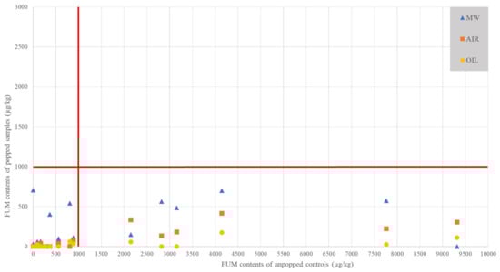 Comparison between the values obtained on the popped samples and the unpopped controls in FUM. Red lines correspond to the European limit of 1000 µg/kg for unpopped controls and popped samples. AIR= hot air popped samples; MW= microwave popped samples; OIL= oil popped samples.