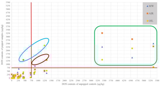 As for the FUM previously, Figure 2 shows the spatial comparisons between the values obtained for the unpopped controls and the corresponding popped samples (MW, AIR, and OIL). The objective is to see the proportion of popped samples with a value below the EU limit for DON (750 µg/kg) taking into account the initial levels of their original unpopped controls [,].