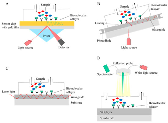 Operating principles of label-free optical immunosensors. (A) Surface plasmon resonance (SPR); (B) optical waveguide lightmode spectroscopy (OWLS); (C) planar waveguide; (D) white light reflectance spectroscopy.