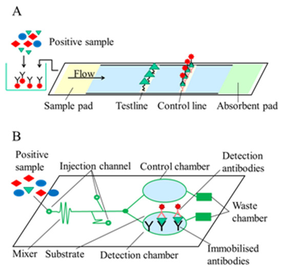 Operating principles of label-based optical immunosensors. (A) Paper-based microfluidic device; (B) microfluidic capillary chip.