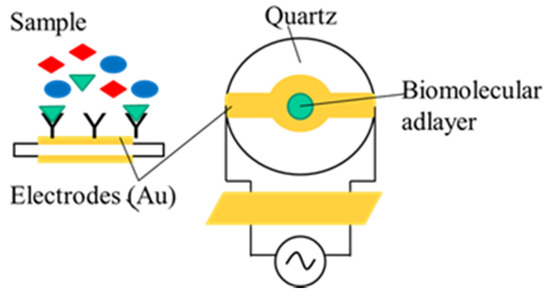 Quartz crystal microbalance (QCM) is a piezoelectric effect-based mass measuring system. The QCM sensor is made of a quartz crystal disk cut to a specific orientation with respect to the crystal axes and sandwiched between two metal electrodes (usually gold) that can be made to oscillate at a defined frequency by applying alternating voltage. Its resonant frequency depends on the thickness of the crystal (Figure 4). The thinner the applied crystal, the higher its resonant frequency and sensitivity. QCM monitors the mass or thickness of the adlayers on the surface of the quartz crystal. The main advantages of QCM are high sensitivity, high stability, fast response, and low cost. It also provides label-free detection capabilities for biosensor applications. However, QCM faces some disadvantages, as its performance significantly depends on the temperature and other environmental parameters, and its sensitivity falls short of the requirements when measuring low molecular weight substances [64]. In order to fulfill the requirements of high sensitivity regarding mycotoxin detection (as they are low molecular weight compounds, so they cannot generate sufficient frequency changes) piezoelectric biosensors need to apply competitive inhibition immunoassay formats, or the signal has to be amplified by applying secondary antibodies or nanoparticles.