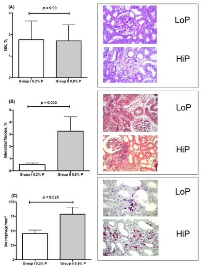 A meta-analysis of 12 cohort studies involving 25,546 CKD non-dialysis patients demonstrated an independent association between serum phosphate levels, kidney failure, and mortality []. Moreover, a retrospective cohort study in 13,772 dialysis incident patients has revealed an association between hyperphosphatemia and other abnormalities of CKD-mineral and -bone disorder with a steeper decline of residual kidney function []. The mechanism by which phosphate restriction delays CKD progression is yet to be established. In an experimental study, we showed that a phosphate-enriched diet was associated with a more impaired renal function, when compared to a low-phosphate diet in Wistar rats submitted to parathyroidectomy and 5/6-nephrectomy, using a fixed parathyroid hormone (PTH) supplementation []. Kusano et al. [] showed that renal-function protection was associated with a low-phosphate (0.3%) diet, regardless of dietary protein content in uremic rats. Rats with the normal phosphate (0.5%) diets, however, presented these benefits only if fed with a very low-protein (8.4%) diet. Taken together, these results denote that the role of dietary phosphate might be more powerful than dietary protein. However, neither of the above-mentioned studies tried to investigate the potential pathways that could be involved in phosphate-related kidney damage.