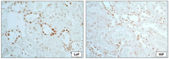 Immunohistochemistry analysis in kidney tissue. α-SMA expression was lower in LoP (A) than in HiP (B). Likewise, PCNA expression was lower in LoP (C) than in HiP (D). However, Beclin-1 expression was higher in LoP (E) than in HiP (F). Positive staining appears as red color; (A,B,E,F) magnification ×200; (C,D) magnification ×400.