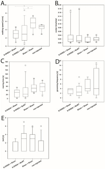 The walking speed during 10 min of the Sham + Sham (median: 5.65 cm/s) and non-injected groups (median: 4.75 cm/s) did not differ significantly (Figure 1A). In contrast, both the 6-OHDA + Sham (median: 3.03 cm/s) and the 6-OHDA + BoNT (median: 2.91 cm/s) groups showed significantly lower walking speed compared with the Sham + Sham group (p < 0.05) (Figure 1A). The further parameters related to curiosity and exploration activity (rearing time) or to anxiety (center time/total time, grooming frequency, number of boli) did not differ significantly between all four groups (p > 0.5) (Figure 1B–E).