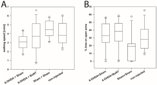 This test further evaluates curiosity and anxiety-like behavior [,,]. The walking speed during a 5-min time span in the four groups did not differ significantly: 6-OHDA + Sham (median: 3.08 cm/s), 6-OHDA + BoNT (median: 3.72 cm/s), Sham + Sham (median: 4.451 cm/s), non-injected (median: 3.82 cm/s) (Figure 2A). Also, the % of time spent on open arms did not differ significantly between the groups during the 5 min of observation time: 6-OHDA + Sham (median: 32.82%), 6-OHDA + BoNT (median: 38.44%), Sham + Sham (median: 19.04%), non-injected (median: 28.05%) (Figure 2B).