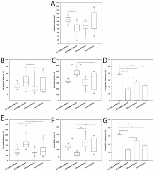 As an important sign of the “lowered mood” and “despair” [,], the immobility latency of the 6-OHDA + BoNT group was significantly longer (median: 155.16 s) compared with all other groups: 6-OHDA + Sham group (median: 80.52 s, p < 0.001), Sham + Sham group (median: 93.20 s, p < 0.01), non-injected group (median: 86.42 s, p < 0.01) (Figure 3E). The immobility time of the 6-OHDA + BoNT group was significantly shorter (median: 26.883 s) compared with all other groups: 6-OHDA + Sham (median: 134.31 s), Sham + Sham group (median: 196.56 s), non-injected group (median: 107.35 s) (p < 0.001) (Figure 3F). Comparably, the immobility frequency in the 6-OHDA + Sham group was significantly higher (mean: 63.60) than in all other groups: 6-OHDA + BoNT group (mean: 27.06, p < 0.001), Sham + Sham group (mean: 48.36, p < 0.05), non-injected group (mean: 37.17, p > 0.001) (Figure 3G). The immobility frequency in the 6-OHDA + BoNT group was significantly lower compared with the 6-OHDA + Sham and the Sham + Sham groups (p < 0.001) (Figure 3G).