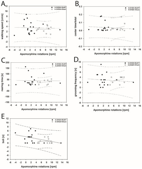 Scatter plots of parameters measured in the OFT and correlated with respective apomorphine-induced rotations of rats of the 6-OHDA + Sham and 6-OHDA + Botulinum neurotoxin-A (BoNT) groups. (A) Walking speed, (B) center time/total time, (C) rearing time, (D) grooming frequency, and (E) the number of boli did not correlate significantly in either group. Regression lines are displayed as solid lines and prediction intervals as dashed lines.