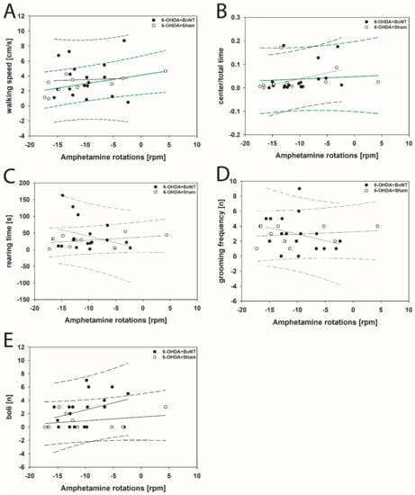 Scatter plots of parameters measured in the OFT and correlated with respective amphetamine-induced rotations of rats of the 6-OHDA + Sham and 6-OHDA + Botulinum neurotoxin-A (BoNT) groups. In 6-OHDA + Sham rats (A) walking speed and (B) center time/total time positively correlated with decreasing rotations. (C) rearing time, (D) grooming frequency, and (E) the number of boli did not correlate significantly in either group. Regression lines are displayed as solid lines and prediction intervals as dashed lines. Green-colored regression lines and prediction interval lines indicate significant differences (p < 0.05).