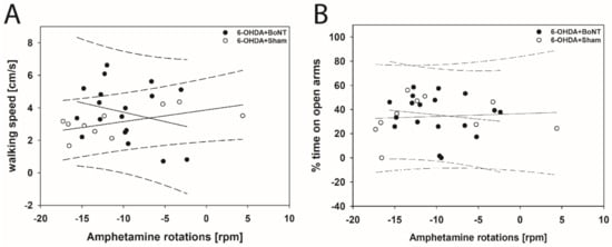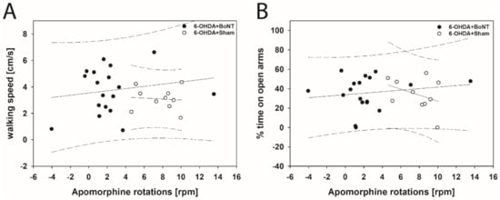 In EPM, neither walking speed nor center time/total time correlated significantly with the respective apomorphine- or amphetamine-induced rotations in rats of both the 6-OHDA + Sham and 6-OHDA + BoNT groups (Figure 6A,B and Figure 7A,B).