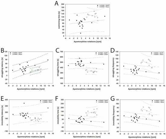 Scatter plots of parameters measured in the FST and correlated with respective apomorphine-induced rotations of rats of the 6-OHDA + Sham and 6-OHDA + Botulinum neurotoxin-A (BoNT) groups. In 6-OHDA + Sham rats (B) struggling latency correlated positively with increasing rotations. All other parameters in either group did not show significant correlations: (A) swimming time, (C) struggling time, (D) struggling frequency, (E) immobility latency, (F) immobility time, (G) immobility frequency. Regression lines are displayed as solid lines and prediction intervals as dashed lines. Green-colored regression lines and prediction interval lines indicate significant correlation (p < 0.05).
