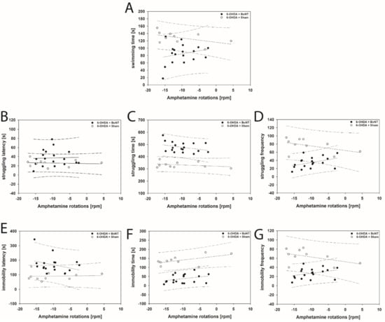 Scatter plots of parameters measured in the FST and correlated with respective amphetamine-induced rotations of rats of the 6-OHDA + Sham and 6-OHDA + Botulinum neurotoxin-A (BoNT) groups. All parameters in both groups did not show significant correlations: (A) swimming time, (B) struggling latency, (C) struggling time, (D) struggling frequency, (E) immobility latency, (F) immobility time, (G) immobility frequency. Regression lines are displayed as solid lines and prediction intervals as dashed lines.