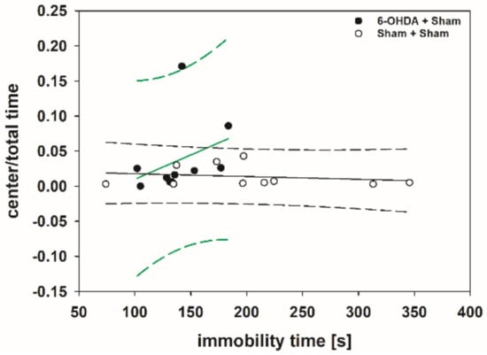 There were no significant relationships between any pair of variables in the Spearman correlation table (p > 0.050) with only one exception (Supplementary Materials Table S2). The immobility time positively correlated with center/total time in the 6-OHDA + Sham group (rs = 0.620; p = 0.048) (Figure 10).