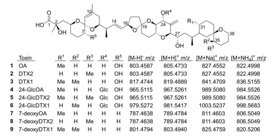 2.4. Detection of OA/DTX Analogues in Dinophysis and P. lima Cultures