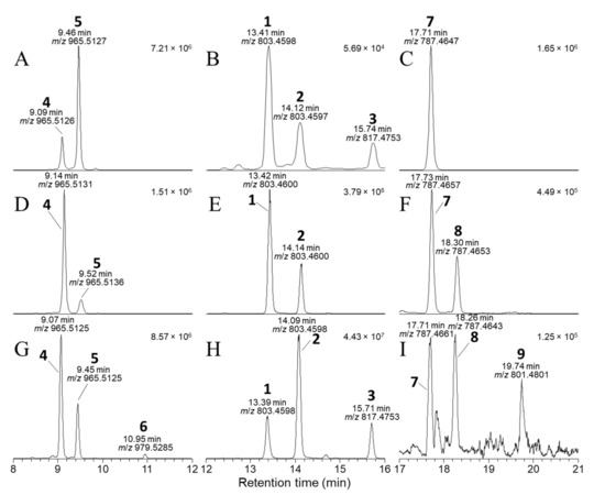 Negative-ionization mode extracted-ion (±5 ppm) SIM chromatograms from LC–HRMS analysis (method B) of: the mixed standard of 4, 5, and 7 containing 1–3 as minor contaminants (A–C); an extract of a D. acuta culture VGO1065 (D–F); and the SPE concentrate from CRM-FDMT1 (G–I). The chromatograms in panels (A,D,G) were extracted at m/z 965.5115 and 979.5272 (m/z of [M−H]− for 4–6); those in panels (B,E,H) at m/z 803.4587 and 817.4744 (m/z of [M−H]− for 1–3); and in panels (C,F,I) at m/z 787.4638 and 801.4794 (m/z of [M−H]− for 7–9). Peaks are labelled with the compound numbers (Figure 1), observed retention times, and m/z values, and the number in the top right-hand corner of each panel indicates the intensity (counts) of the highest peak. A corresponding set of peaks was also observed in positive-ionization chromatograms (e.g., Figure S2).