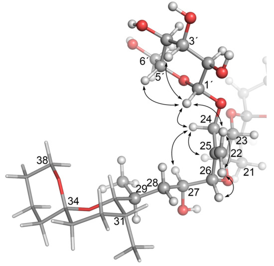Molecular model of OA 24-O-β-d-glucoside (4) based on the modelled structure of 1 that Larsen et al. [19] derived from the X-ray crystal structure of Tachibana et al. [28], showing the glucoside-containing region. The arrows show structurally diagnostic through-space correlations relating to the glucosyl moiety observed in SELROESY NMR experiments. Atom numbering is as per Figure 1, with NMR assignments in Table 2 and Table 3. Rings F and G are shown with sticks, and C-1–C-17 are omitted for clarity.