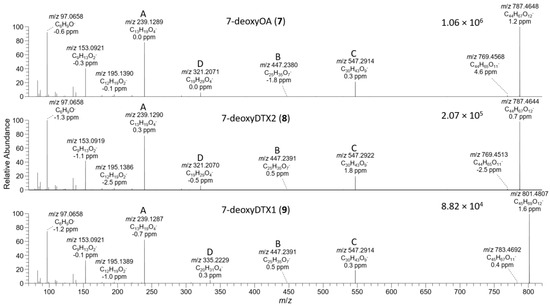 HRMS/MS spectra of [M−H]− for 7–9 obtained by LC–HRMS/MS (method B) in negative ionization mode. The spectrum of 7 was from the mixed standard; the spectrum of 8 was from the extract of the D. acuta culture; and the spectrum of 9 was from an extract of P. lima JHPL2. Spectra of 1–3 obtained under identical conditions are shown in Figures S3 and S4, and corresponding spectra of 4–6 are shown in Figure 4. Spectra of 7–9 in positive ionization mode are shown in Figure 8. Ions marked with letters refer to major structurally diagnostic ions listed in Table 1, with additional information in the Supplementary Material.