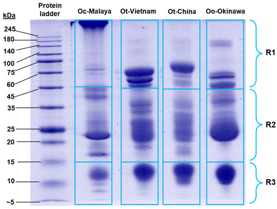 Sodium dodecyl sulfate-polyacrylamide gel electrophoresis of Ovophis pit viper venoms under reducing conditions. Proteins migrated on the gel were categorized into three molecular weight ranges, R1–R3 (<15 kDa, 15–45 kDa, and >45 kDa, respectively), and the gel band intensities were estimated with Pierce myImage Analysis Software. Abbreviations: Oc-Malaya, Ovophis convictus (West Malaysia); Ot-Vietnam, Ovophis tonkinensis (northern Vietnam); Ot-China, Ovophis tonkinensis (southern China); Oo-Okinawa, Ovophis okinavensis (Okinawa, Japan).
