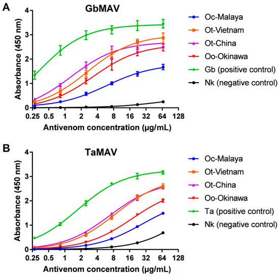 The immunoreactivity of the antivenoms toward the four Ovophis venoms was examined through an indirect enzyme-linked immunosorbent assay (ELISA), optimized in the laboratory [56]. N. kaouthia venom was used as a negative control for all assays. Positive controls were the venoms of G. brevicaudus (for GbMAV), D. acutus (for DaMAV), T. albolabris (for TaMAV), and C. rhodostoma (for CrMAV), respectively. Briefly, 96-well immunoplates were coated overnight with 10 ng of Ovophis venom in 100 µL coating buffer at 4 °C. The plates were washed four times with phosphate-buffered saline (Oxiod, Hampshire, UK) containing 0.5% Tween 20 (Sigma-Aldrich, St. Louis, MO, USA) (PBST). Then, 100 µL of each antivenom dilution (1:3000) from a stock of 10 mg/mL were added to each well and incubated for one hour at room temperature. The wash step was repeated and 100 µL of 1:10,000 diluted horseradish peroxidase-conjugated anti-horse IgG (Jackson ImmunoResearch Inc., West Grove, PA, USA) in PBST was added to each well and incubated for 1 h at room temperature. After another cycle of washing, 50 µL of TMB substrate (3,3′,5,5′-Tetramethylbenzidine) solution was added to each well and incubated in the dark for 25 min at room temperature. Finally, 50 µL of 12.5% sulfuric acid was added to terminate the reaction before the absorbance reading at 450 nm. The experiments were performed in triplicate and absorbance values were expressed as means ± S.E.M.