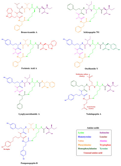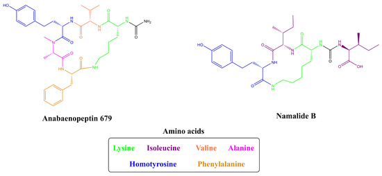 Example of Anabaenopeptins with unusual structures lacking one amino acid (Anabaenopeptin 679) and two amino acids (Namalide B) residues [53,55,56].