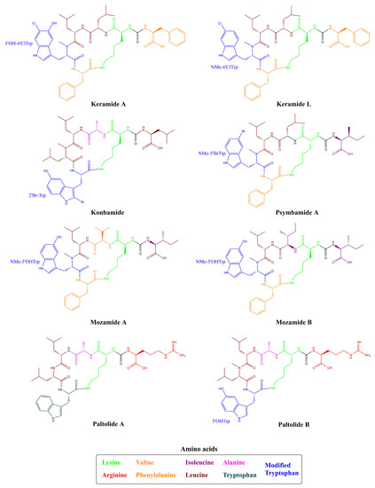 Besides these distinct nomenclatures and structures for Anabaenopeptins obtained from cyanobacteria, this class of peptides can also be found in sponges, which were the initial organisms to be identified the first anabaenopeptin-related compound, not in a cyanobacterium [31,32]. Konbamide and Keramide A (Table 1 and Figure 4) were isolated from the marine sponge Theonella sp., which showed distinct features from cyanobacterial anabaenopeptins having a cyclic hexapeptide structure and the presence of an ureido bond. Both variants have L-Lys residue and also they contain a modified Tryptophan (Trp) residue at position 6. Konbamide had 2-bromo-5-hydroxytryptophan (2’Br-Trp) in position 6; in comparison, Keramide A possessed a 6-chloro-5-hydroxy-N-methyltryptophan (5’OH-6’ClTrp) in position 5 [31,32]. Keramide L was detected in Theonella sp. SS-342 together with Keramide K (a thiazole-containing cyclic peptide not belonging to anabaenopeptin-class). Keramide L shared similar features to Konbamide and Keramide A, having a modified Trp residue in position 5: a 6-chloro-N-methyltryptophan (NMe-6’ClTrp) residue [30]. Besides, the marine sponge Theonella swinhoei demonstrated to produce a similar class of peptides, named Paltolides A-C, and 3 additional peptides which were previously detected in the Australian sponge Melophlus sp. [51]. Unlike Konbamide and Keramide A, Paltolides A-C and the 3 unnamed peptides have a D-Lys residue in position 2, but 4 of these structures had modified Trp residues, and 3 of these modifications were also related to the presence of a halogen element (Bromo or Chlorine) similar to Konbamide and Keramides A and L [28]. Other examples from sponges are Mozamides A and B produced by Theonella sp. from Mozambique. Similar to other anabaenopeptin-like peptides from sponges, both Mozamides have the same modified Trp (N-methyl-L-5′-hydroxytryptophan) residue in position 5 and an L-Lysine at position 2. However, both have an amino acid in D-configuration in position 3: D-valine in Mozamide A; and D-Isoleucine in Mozamide B [29].