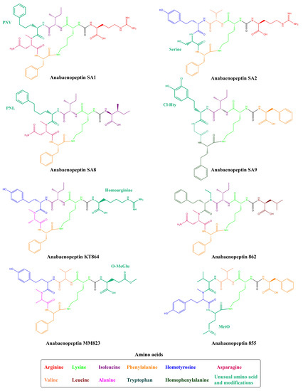 Among the most recurrent peptides encountered in the environment are anabaenopeptins (APs), a family of cyclic peptides containing six amino acid residues [19]. They have been found in an enormous variety of cyanobacteria isolated from both the aquatic and terrestrial environments, including Anabaena, Nostoc, Microcystis, Planktothrix, Lyngbya, and Brasilonema [12,20,21,22,23,24]. In their general structure is a well-conserved Lysine (Lys) residue in D-configuration, which is responsible for the ring formation and five additional variable amino acids, either proteinogenic or non-proteinogenic, resulting in 124 described AP variants from cyanobacteria (Supplementary Table S1). [19]. Besides their structural variety, molecules belonged to this group exhibit an impressive functional diversity, which includes inhibitory activity for proteases, phosphatases, and carboxypeptidases [22,25,26].