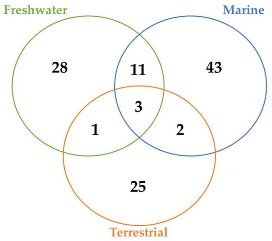 A total of 45, 29, and 12 cyanobacteria strains from freshwater, marine and terrestrial environment have been analyzed for AP production, respectively. As seen in Table 2 and according to the literature [34,40,41,53,76,77,78,79,80,81,82,83,84,85], marine strains produced a total of 50 different variants of APs, in comparison to 43 and 34 variants from freshwater, and terrestrial strains, respectively (Figure 7). Thus, marine cyanobacteria demonstrate to produce a higher number of distinct APs variants in comparison to the remaining strains from different sources. However, APs from freshwater environments have the greatest diversity of amino acids in the majority of positions (Figure 8). Thus, these features could be associated to different obstacles faced in their respective environments as well as the fact that both belong to aquatic environments [86], however, this hypothesis requires further studies. Some of those APs are shared among different strains isolated from distinct environments: 2 anabaenopeptins (A and B) variants were detected in all ecosystems; in comparison, strains from both aquatic habitats had 13 APs variants in common (D, F, J, 807, NZ841, Oscillamide Y, and Nodulapeptins B, C, 855B, 871, 879, 897 and 915A); in contrast, only anabaenopeptin C were produced by both terrestrial and freshwater, and none Anabaenopeptin variant was shared by both terrestrial and marine strains.