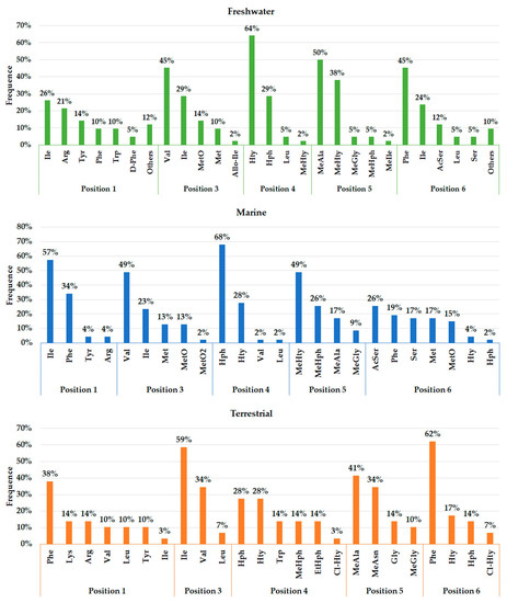 Relative frequency (%) of amino acids in positions 1 and 3–6 of variants of anabaenopeptins characterized according to their environment (freshwater, marine and terrestrial). The total number of variants with elucidated sequences were 42, 47 and 29 for freshwater, marine, and terrestrial environments, respectively. Position 2 was omitted as the D-Lys residue being conservated among AP variants.