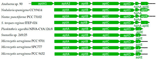 Rouhiainen and co-workers [110] detected gene clusters related to the production of APs in Anabaena sp. 90, Nodularia spumigena CCY9414, and Nostoc punctiforme PCC3102. In Anabaena sp. 90, five Open Reading Frame (ORF) were identified to be encoding NRPSs (aptA1, aptA2, aptB, aptC, and aptD) and two additional genes to be encoding proteins with similarity to HMGL-family (aptE) and ABC-transporter protein (aptF). When compared to the clusters identified in N. spumigena and N. punctiforme, 4 NRPS and two homolog proteins to AptE and -F were also detected, indicating that Anabaena sp. had an additional NRPS gene (aptA1 and aptA2). Similar to AnaA from Planktothrix rubescens NIVA-CYA 98, AptA1 and AptA2 also have an epimerase domain indicating their role as initial enzymes, and AptC possessing the N-methyltransferase domain as AnaC [110]. The proteins AptA1/AptA2, AptB, AptC, and AptD are homologs to the NRPS proteins AnaA, AnaB, AnaC, and AnaD, sharing the same functions, respectively.