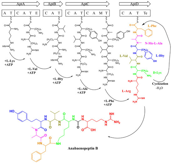 Besides the initiation step and the formation of the ureido bond between the first residue and the conserved Lys, several steps of elongation of the peptide are required to produce a fully mature peptide. The signature sequences analyzed of the A-domains of these NRPS enzymes, such as AptB and AptC, are consistent with the respective amino acid residue of the final product and confirmed in vitro by biochemical methods. Also, usually, the fifth module bears an N-methyltransferase domain, as seen in AptC and their homologs, responsible for the N-methyl in Ala in position 5 of Anabaenopeptin B, as seen in Figure 11 [110].