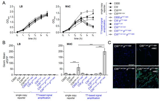 Next, we characterized the growth behavior of wild-type and both reporter strains in lysogeny broth (LB) and LB containing MitC (0.5 µg/mL). No growth differences were observed in LB (Figure 2A). In contrast, 3h after exposure to MitC, the OD600 of lysis-proficient CWsfgfp and reporterless background strain C600W34 (CW) strongly declined, indicating phage lysis, while the 933W-deficient parental strain (C600) and the non-lytic CWsfgfpΔlys continued growing. To study the performance of the reporter strains, we determined the mean fluorescence intensity (MFI) for sfGFP within bacteria by FACS after 5 h (Figure 2B). No signal was observed for both control and reporter strains in LB, showing that the reporter is tightly repressed in the absence of SOS stress. Under MitC-treated conditions, sfGFP MFI was overall slightly increased for all reporter and control strains. This is likely caused by higher the autofluorescence of dead bacterial cells. The lysis-proficient CWsfgfp reporter did not show increased sfGFP MFI compared to C600 or CW, which is likely due to the fact that bacteria inducing the reporter will undergo lysis briefly. Accordingly, for the non-lytic CWsfgfpΔlys, a faint but significant increase in sfGFP MFI was observed (p < 0.001).