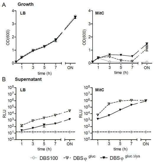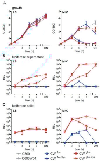 Next, we characterized growth behavior of wild-type and luciferase reporter strains in LB and LB containing MitC (0.5 µg/mL; Figure 3A) and determined the activity of the two different luciferases (Fluc and Gluc) in the culture supernatant or the bacterial pellet at different time points (Figure 3B,C). Similar to observations made for sfGFP reporters, 3 h after exposure to MitC, the OD600 of C600W34 (CW) and lysis-proficient reporter strains strongly declined, indicating phage lysis. No lysis was seen for strains in LB (Figure 3A) or prophage-deficient C600 and lysis-deficient reporter strains (Figure 3A).