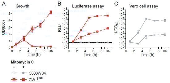 The lytic reporter strain (CWgluc) released Gluc into the culture supernatant within 3 h after MitC induction. Gluc activity in the supernatant reaches a maximum at 5 h, where it remains stable for at least 20 h. Moreover, in the absence of MitC treatment, CWgluc continuously releases low levels of Gluc into the culture supernatant. We hypothesized that Gluc release from CWgluc would reflect the kinetics of phage-mediated Stx2 release from the parental E. coli C600W34 strain. In order to test this idea, we cultured CWgluc and the Stx2a producer C600W34 in LB in the presence and absence of MitC (0.5 µg/mL) and quantified Gluc and Stx2a in parallel in the supernatant. The strains exhibit highly similar growth characteristics (Figure 4A). To quantify Stx2a toxin levels, we used a Vero cell assay. Vero cells are highly susceptible to Stx-mediated killing and can therefore be used for detecting and quantifying Shiga toxins [35]. We determined the reciprocal of the supernatant concentration at which >50% of Vero cells were killed (1/(CD50]): The higher 1/(CD50), the more Stx2a is present in the sample. During growth in LB, CWgluc and C600W34 steadily release Gluc (Figure 4B) and Stx2a (Figure 4C), respectively, into the supernatant. This is likely attributable to the low rates of spontaneous prophage induction in the bacterial population. In response to MitC, both Gluc and Stx2a levels are significantly increased 3 h after treatment and reach a maximum at 5 h (~6 log-fold). This determines that the kinetics of Gluc release are indeed comparable to Stx2a release, and the culture supernatant from the lytic reporter CWgluc can be used as a proxy for Stx2a levels in the bacterial culture supernatant. For this reason, but also due to its ease of use, scalability and high sensitivity, the CWgluc could be employed for medium-to-high-throughput applications, such as metabolite, chemical or drug screening.