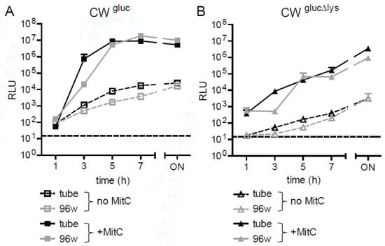 Comparison of Gluc reporter assay in tubes and 96-well format. Precultures of reporter strains CWgluc (A) or CWglucΔlys (B) in E. coli C600W34 background were grown in LB until mid-log phase (OD600 of approximately 0.5). Afterward, bacteria were diluted either in LB or in LB supplemented with MitC (0.5 µg/mL) to an OD600 of 0.1. The 250 µL/well (96-well plate) and 4 mL/tube were transferred and incubated at 37 °C while shaking. Samples were taken at indicated time points, and Gluc activity was measured as described in Materials and Methods in the culture supernatant depicted as RLU per 10µL supernatant. Data are shown as mean ± standard deviation of 3 replicates.