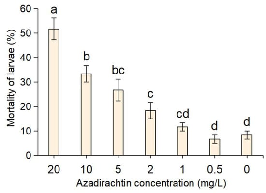 Mortality rates of S. frugiperda after three days of feeding with maize leaves treating different concentrations of azadirachtin. The ‘0′ on the x-axis was the control, which means maize leaves without azadirachtin. Data are presented as mean ± standard error (S.E.). Different letters above bars indicate significant differences in mortality among treatments due to concentration effects at p < 0.05 level based on Tukey’s honestly significant difference (HSD) test (n = 3).