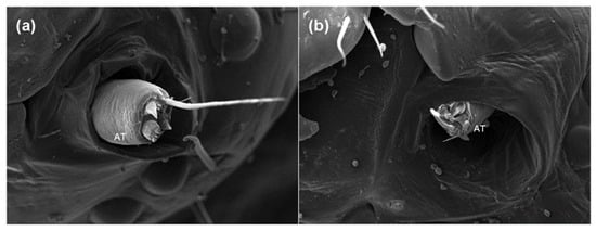 Morphological differences in the antenna of the 5th larvae of S. frugiperda after feeding on maize leaves without azadirachtin (a) and treated with 1 mg/L of azadirachtin (b); AT: Antenna.