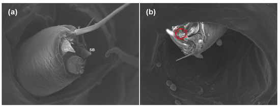 Morphological differences in the sensilla of the 5th larvae of S. frugiperda after feeding on maize leaves without azadirachtin (a) and treated with 1 mg/L of azadirachtin (b); SB: sensillum basiconicum.