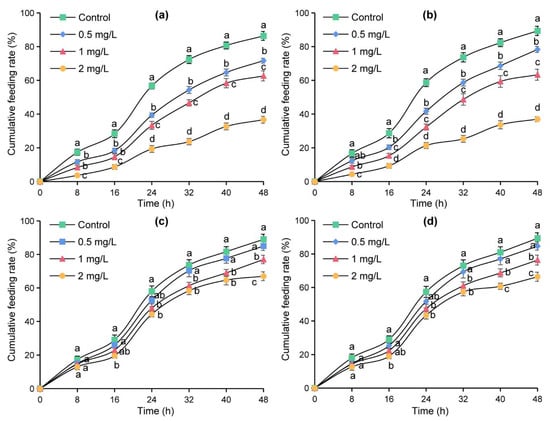 Cumulative feeding rates of S. frugiperda after treatment with different concentrations of azadirachtin on sensillum basiconicum (a), sensillum styloconicum (b), sensillum trichodeum (c), and sensillum chaeticum (d), respectively. Data are presented as mean ± standard error (S.E.). Different letters at each recording time point indicate significant differences among treatments at p < 0.05 level based on Tukey’s HSD test (n = 3).