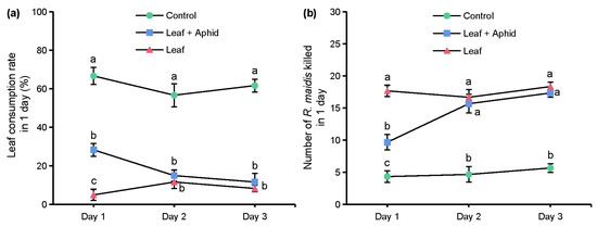 Leaf consumption rate in 1 day (a) and number of R. maidis killed in 1 day (b). ‘Leaf’ indicates leaves soaked with 1 mg/L of azadirachtin solution and aphids sprayed with 70% acetone aqueous solution. ‘Leaf + Aphid’ indicates treating leaves and aphids with 1 mg/L of azadirachtin solution. ‘Control’ indicates leaves and aphids treated with 70% acetone aqueous solution. Data are presented as mean ± S.E. Different letters at each sampling day indicate significant differences among treatments at p < 0.05 level based on Tukey’s HSD test (n = 3).