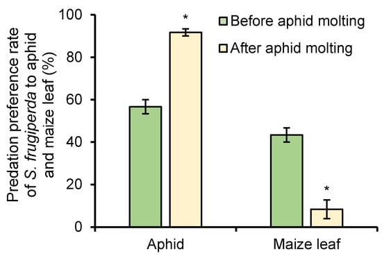 Predation preference rate of S. frugiperda to aphid and maize leaf before and after aphid molting under 1 mg/L of azadirachtin treatment. Data are presented as mean ± S.E. ‘*’ represents significant differences between two situations at p < 0.05 level based on Tukey’s HSD test (n = 3).