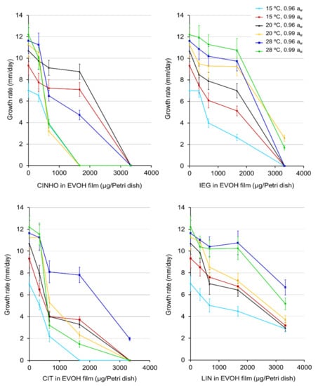 Different response profiles of F. sporotrichioides were observed concerning the type of bioactive film. Fungal GR was significantly affected by this factor (p-value < 0.001). According to the active compound the order of film effectivity was EVOH-CIT ≈ EVOH-CINHO > EVOH-IEG > EVOH-LIN. The Duncan’s test confirmed these results (Supplementary Table S1). With few exceptions, GR also decreased with increasing dose of the active compound regardless of the film type, aw and temperature. With regard to dose, the Duncan’s test established four homogeneous groups without overlapping for doses 333, 666, 1665, and 3330 µg/fungal culture (25 g of oat grains), respectively (Supplementary Table S1). The dose × film type and temperature × film type interactions were also significant (p-value < 0.05).