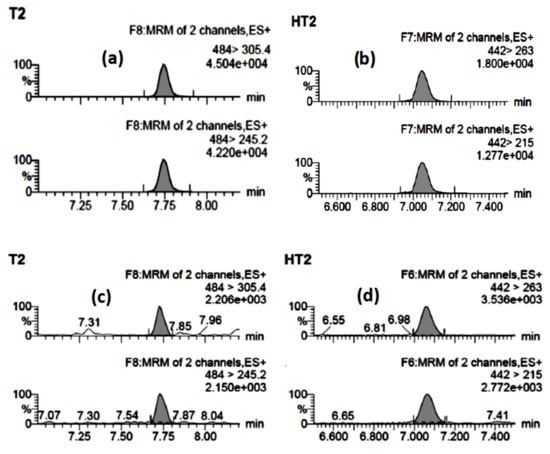 UPLC-(ESI+)-MS/MS MRM chromatograms of T-2 and HT-2: (a) standard solution of T-2 (90 ng/mL); (b) standard solution of HT-2 (75 ng/mL); (c) T-2 in an extract from a culture of F. sporotrichioides on oat grain; (d) HT-2 in an extract from a culture of F. sporotrichioides on oat grain; for each mycotoxin, the upper chromatogram corresponds to the quantifier ion (Q) and the lower one corresponds to the qualifier ion (q). Notation note: ye + 00x means y × 10x.