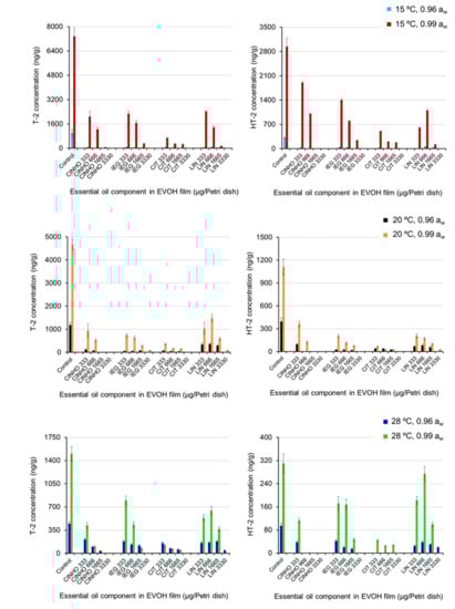 The previously indicated methodology [] was followed with some differences. Briefly, the assays were performed in 25 g autoclaved oat kernels containing undetectable levels of T-2 and HT-2. Oat grain aw was adjusted to 0.99 or 0.96. The sterilized grains were spread into sterile Petri dishes and circular pieces of each bioactive EVOH film were stuck on the inner part of the lid. The final doses of each component were calculated []. Culture media were inoculated with the F. sporotrichioides strain, capped, and sealed with Parafilm M®. The Petri dishes undergoing the same treatment were enclosed in sealed plastic containers together with beakers of a glycerol–water solution matching the same aw as the treatments. Treatments and control cultures were incubated at 15, 20, and 28 °C for 21 days in the darkness. Experiments were run in triplicate and repeated twice.